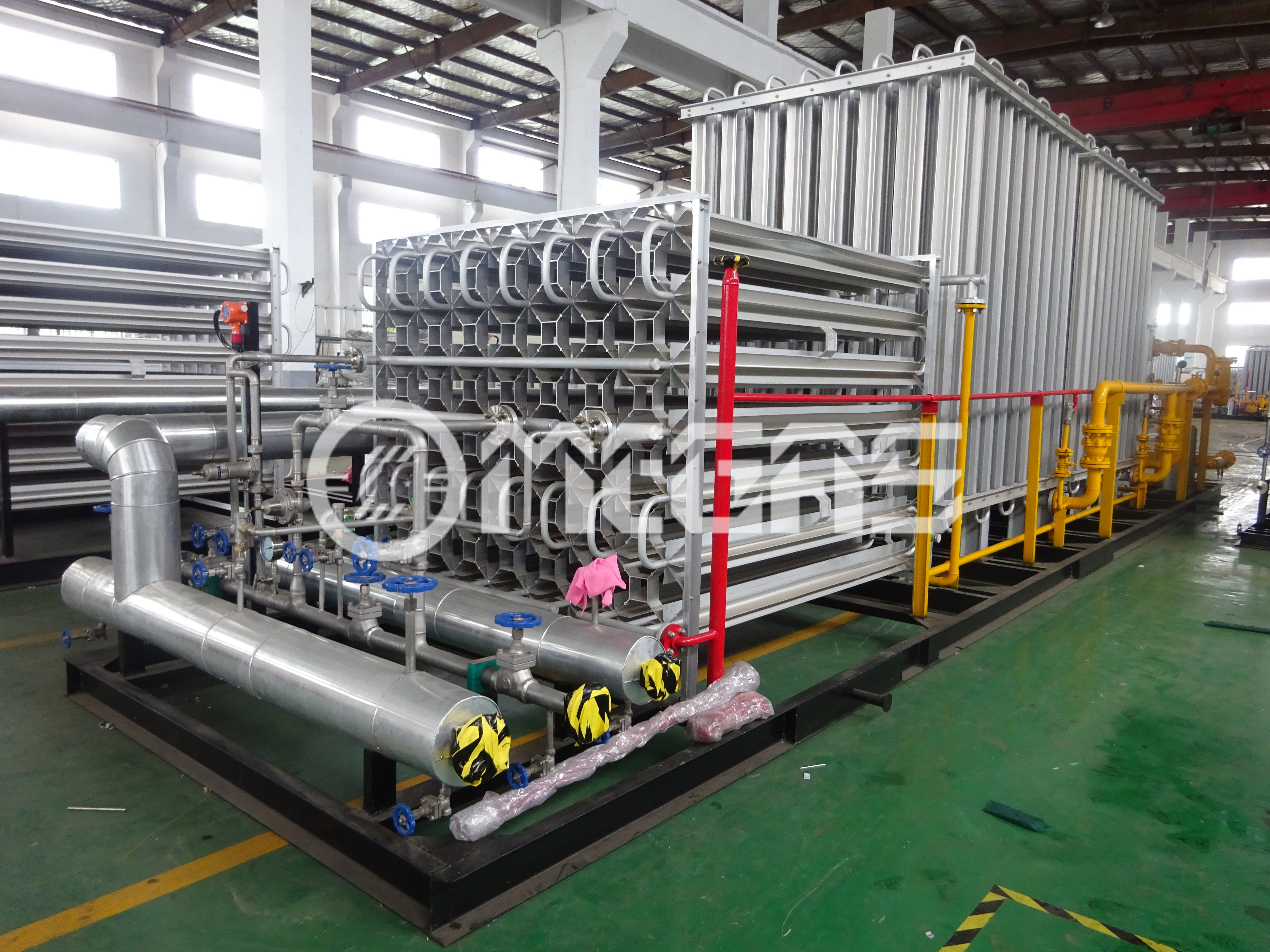 1.原理:因客戶現(xiàn)場條件或投資成本因素受限,對卸車增壓部分、儲罐增壓部分以及氣化調(diào)壓部分進行整合優(yōu)化,將三個部分整合在集成基座上實現(xiàn)綜合功能。在有限的空間內(nèi)將增壓設(shè)備、氣化設(shè)備、調(diào)壓設(shè)備、復(fù)熱設(shè)備、計量設(shè)備、加臭設(shè)備集中合理布局,達到客戶的使用功能,達到效果。